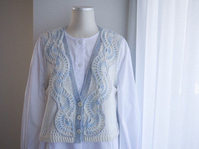 シャツやワンピースにぴったりのベストを編みました。何と言ってもこの大きな、なみなみが特徴です。 コットンとシルクを使用しているので春夏向きのアイテムで、独特な模様ながらも淡い色彩なので様々なお洋服に合います。 カラー:pale blue サイズ:身幅50cm 着丈46cm コットン 65% シルク 30% ナイロン 5%