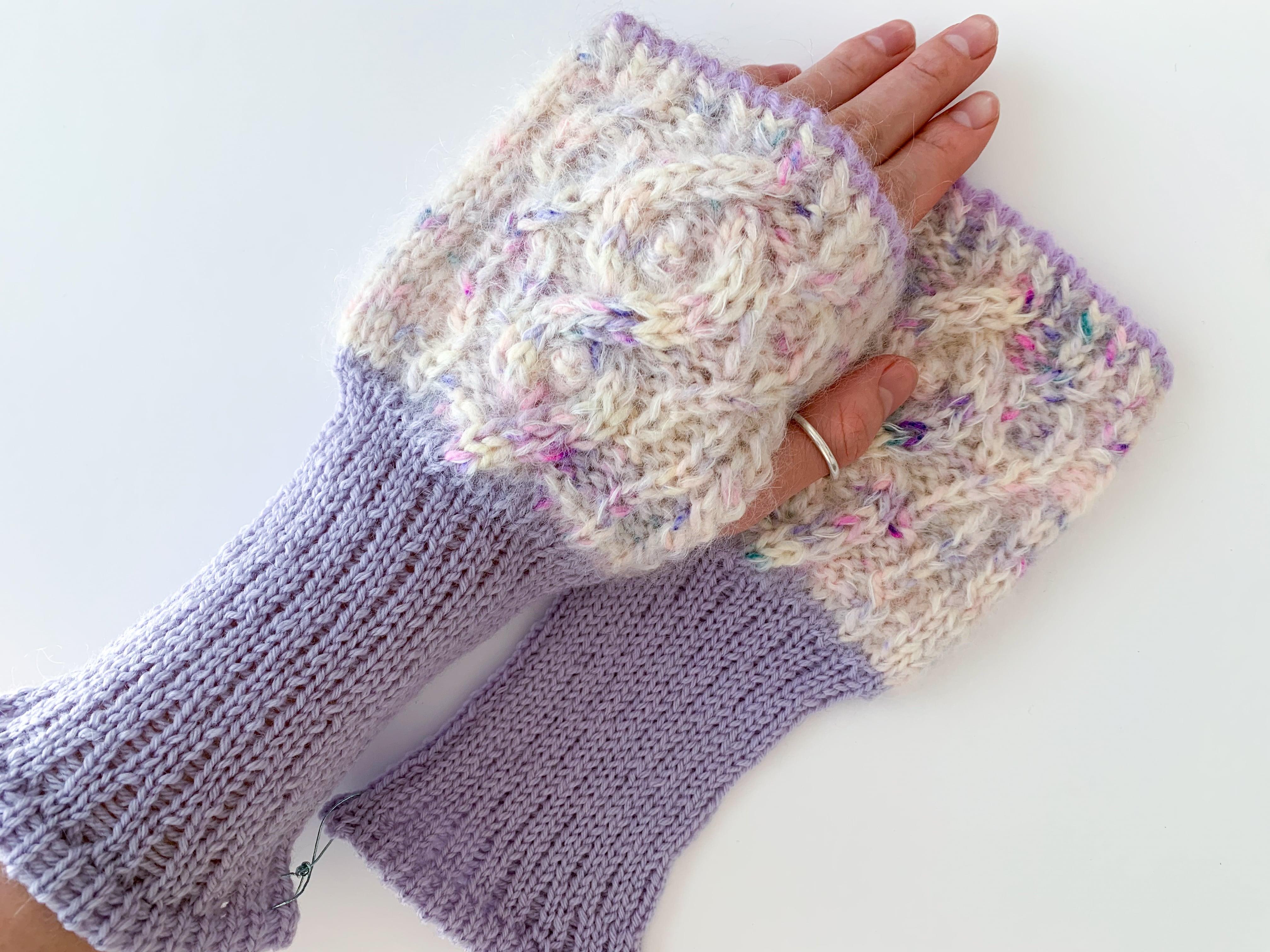 アクセントカラーとふわふわのアラン模様が特徴のハンドウォーマー