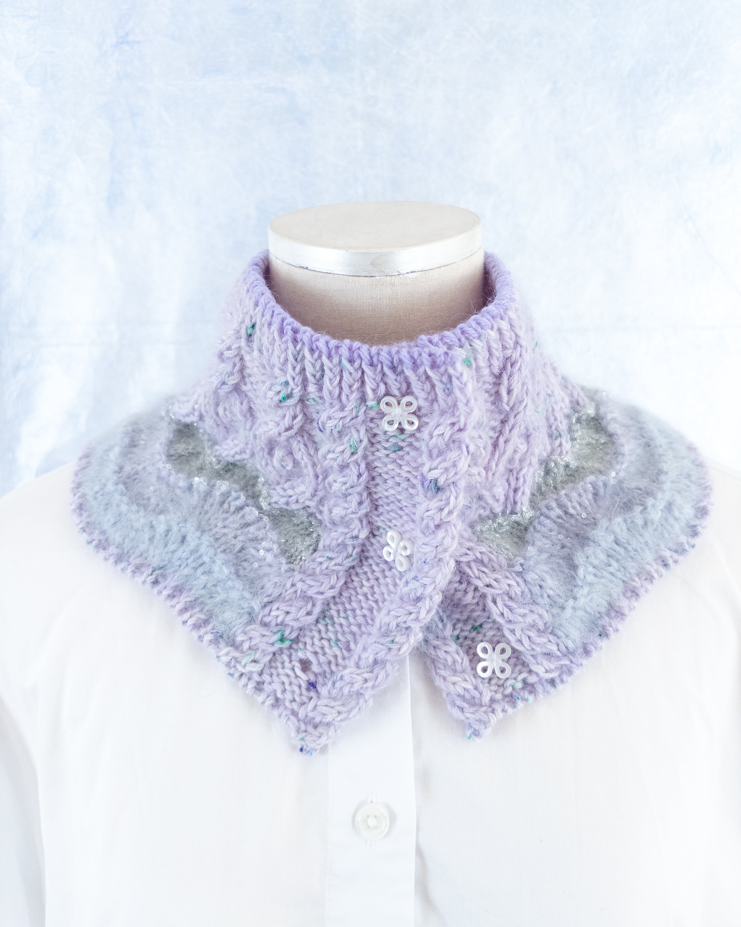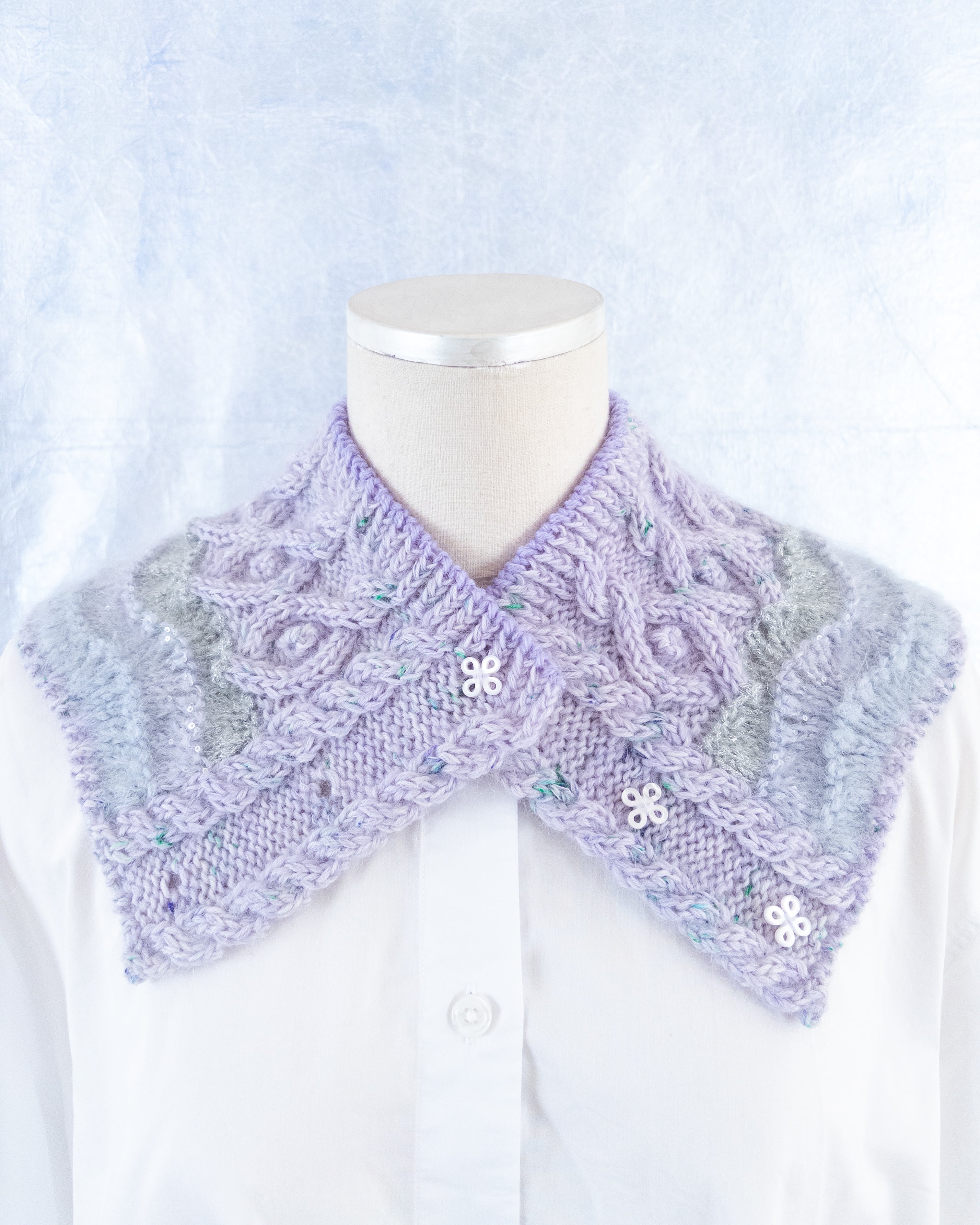 ボタンを留める数によって3種類の使い方ができ、ウールにモヘヤ、アルパカ、ラメ…様々な素材とアラン模様の組み合わせが魅力のネックウォーマー