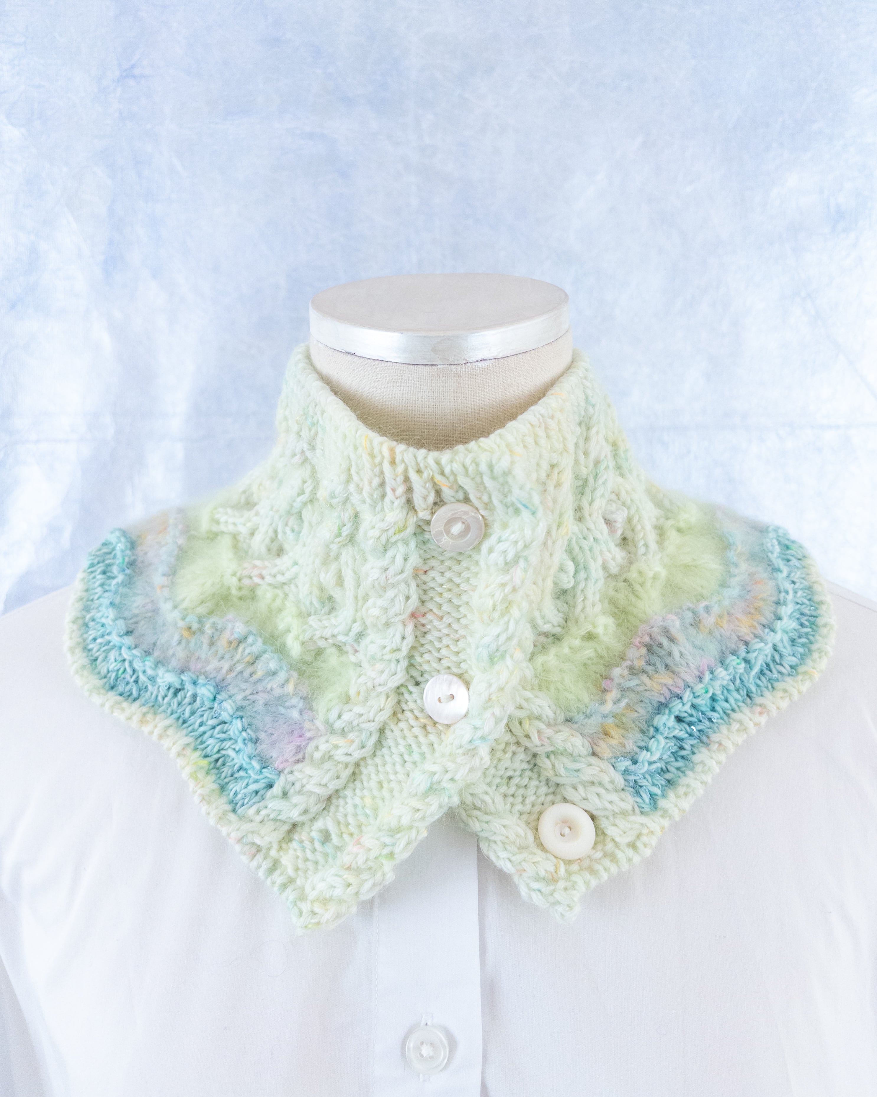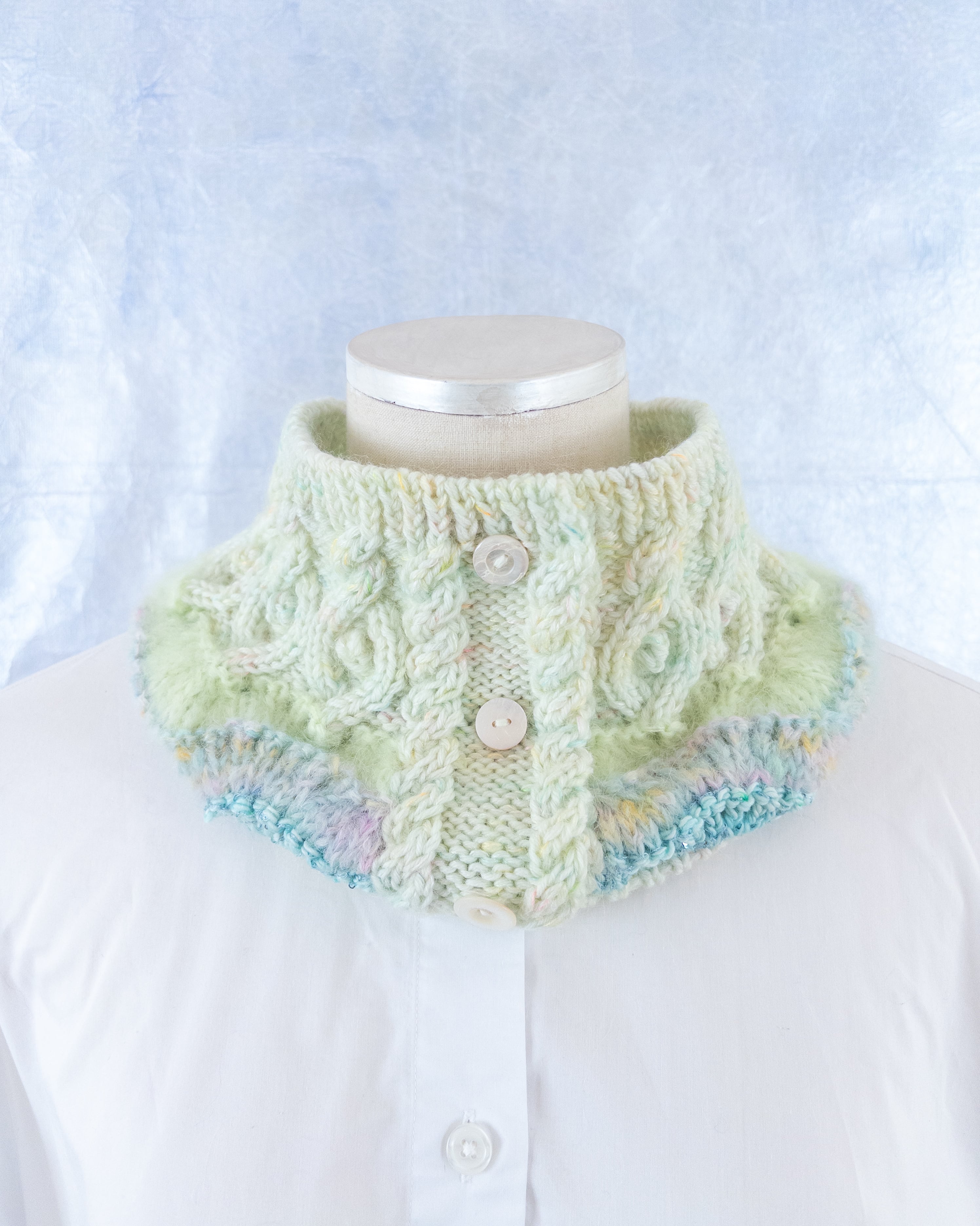 ボタンを留める数によって3種類の使い方ができ、ウールにモヘヤ、アルパカ、ラメ…様々な素材とアラン模様の組み合わせが魅力のネックウォーマー