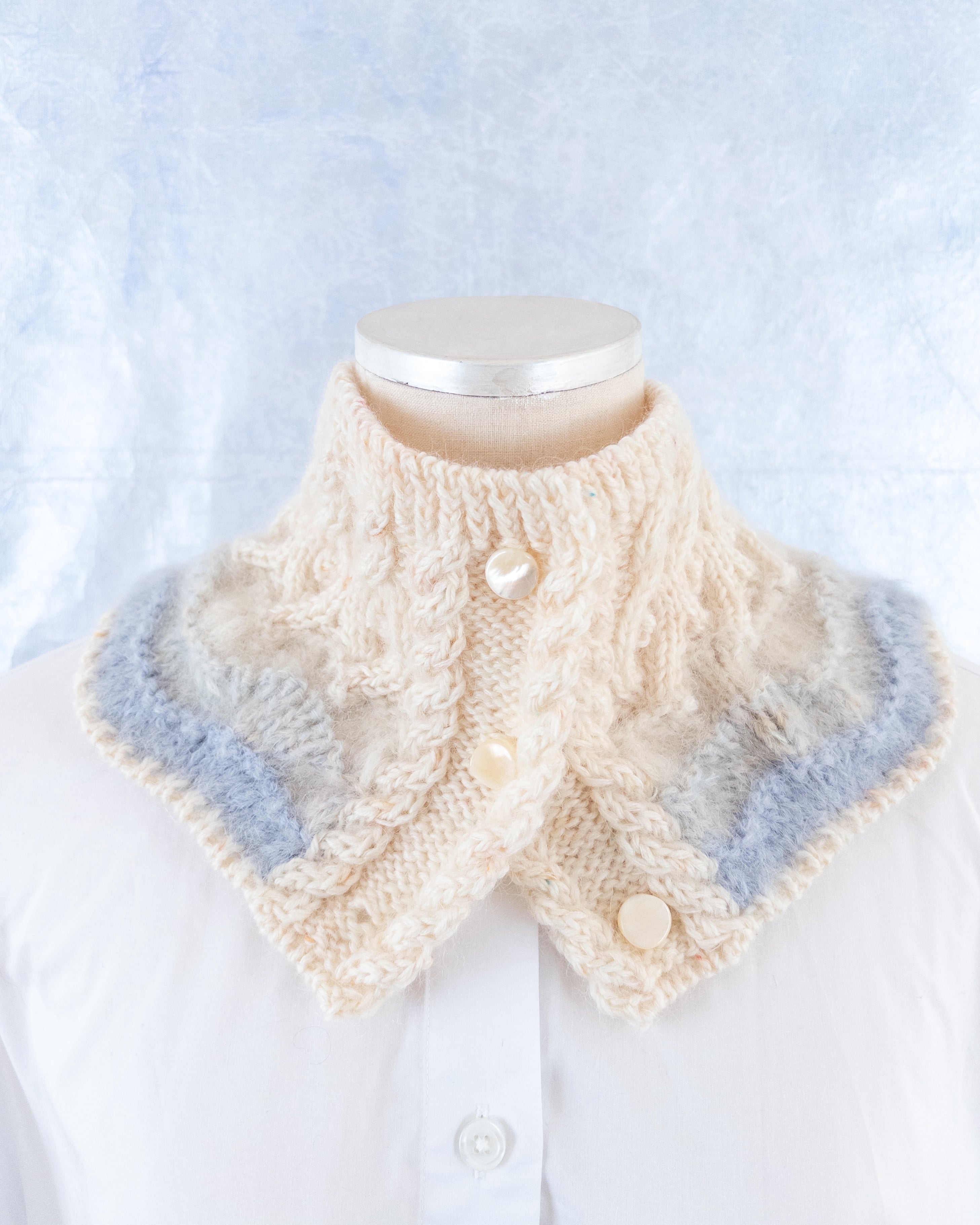 ボタンを留める数によって3種類の使い方ができ、ウールにモヘヤ、アルパカ、ラメ…様々な素材とアラン模様の組み合わせが魅力のネックウォーマー